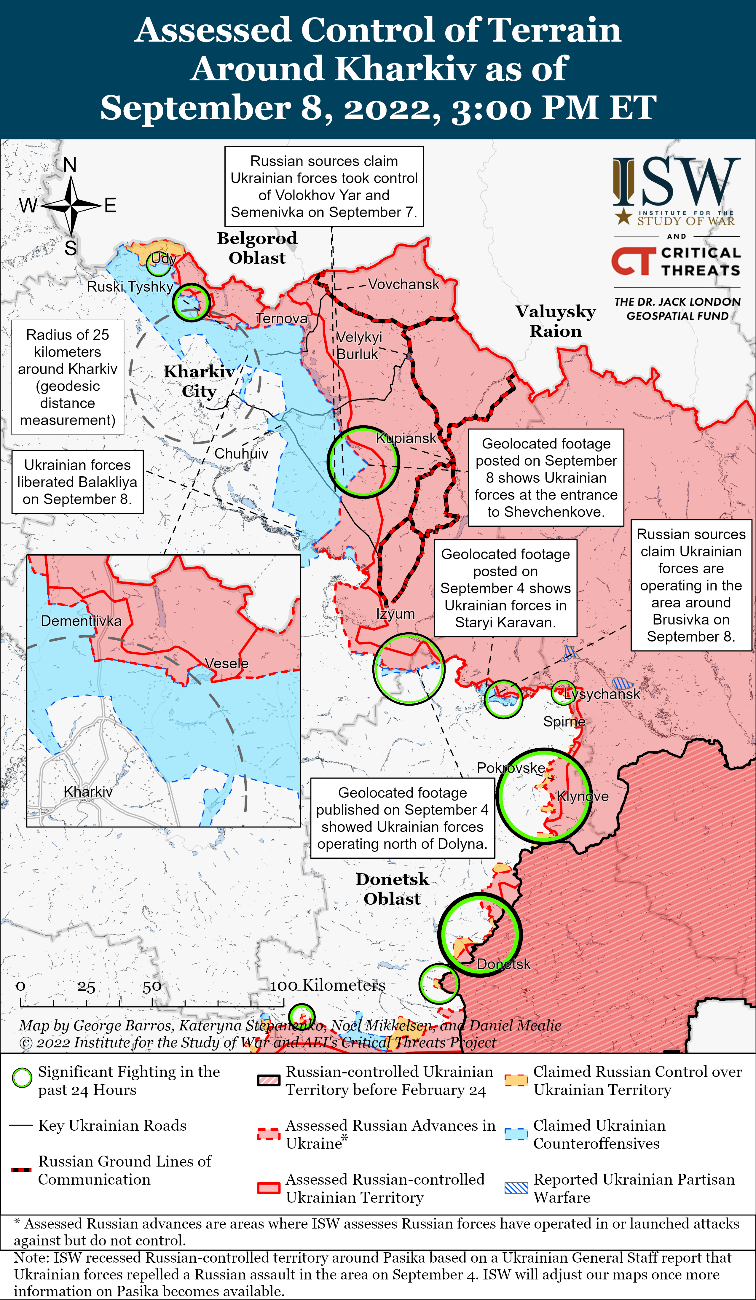 - Ukrainian forces in the Kharkiv Oblast counteroffensives advanced to within 20 kilometers of Russia’s key logistical node in Kupyansk on September 8.