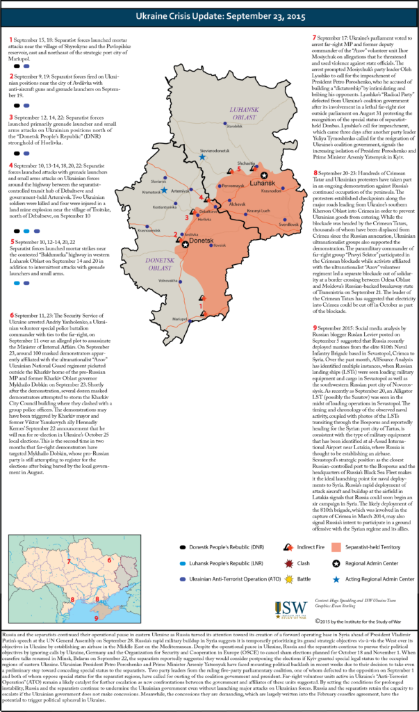 Russia and the separatists continued their operational pause in eastern Ukraine as Russia turned its attention toward its creation of a forward operating base in Syria ahead of President Vladimir Putin’s speech at the UN General Assembly on September 28.